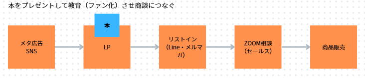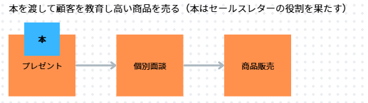 「本 → 教育(信頼構築) → 面談 → 高額商品販売」につなげるモデル。